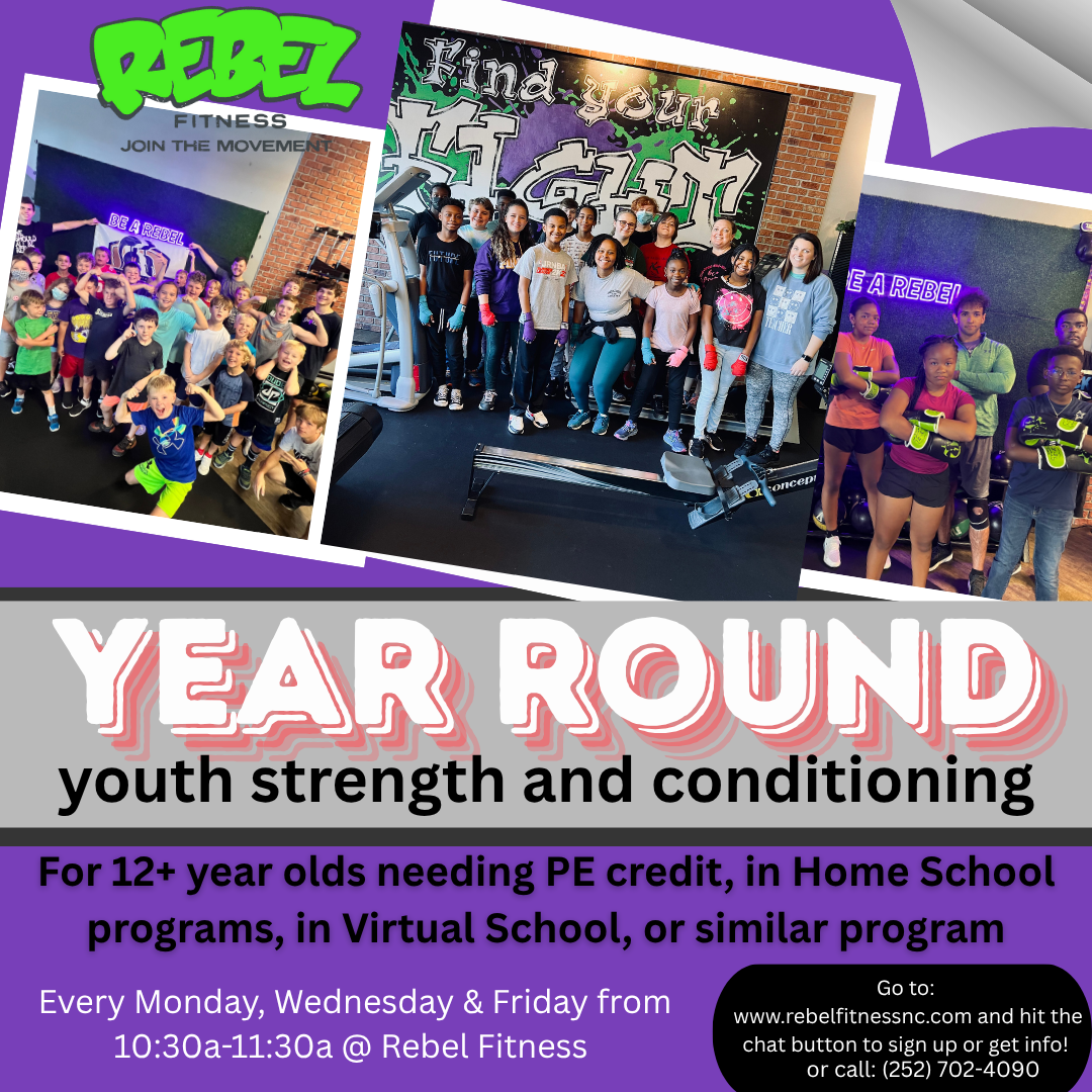 Need P.E.? Come joing the "youth strength and conditioning" class on Mondays, Wednesdays and Fridays from 10:30-11:30am at Rebel Fitness. This class was to meet the need to kids who are currently being home schooled, need a PE credit for their school or in virtual school, etc.